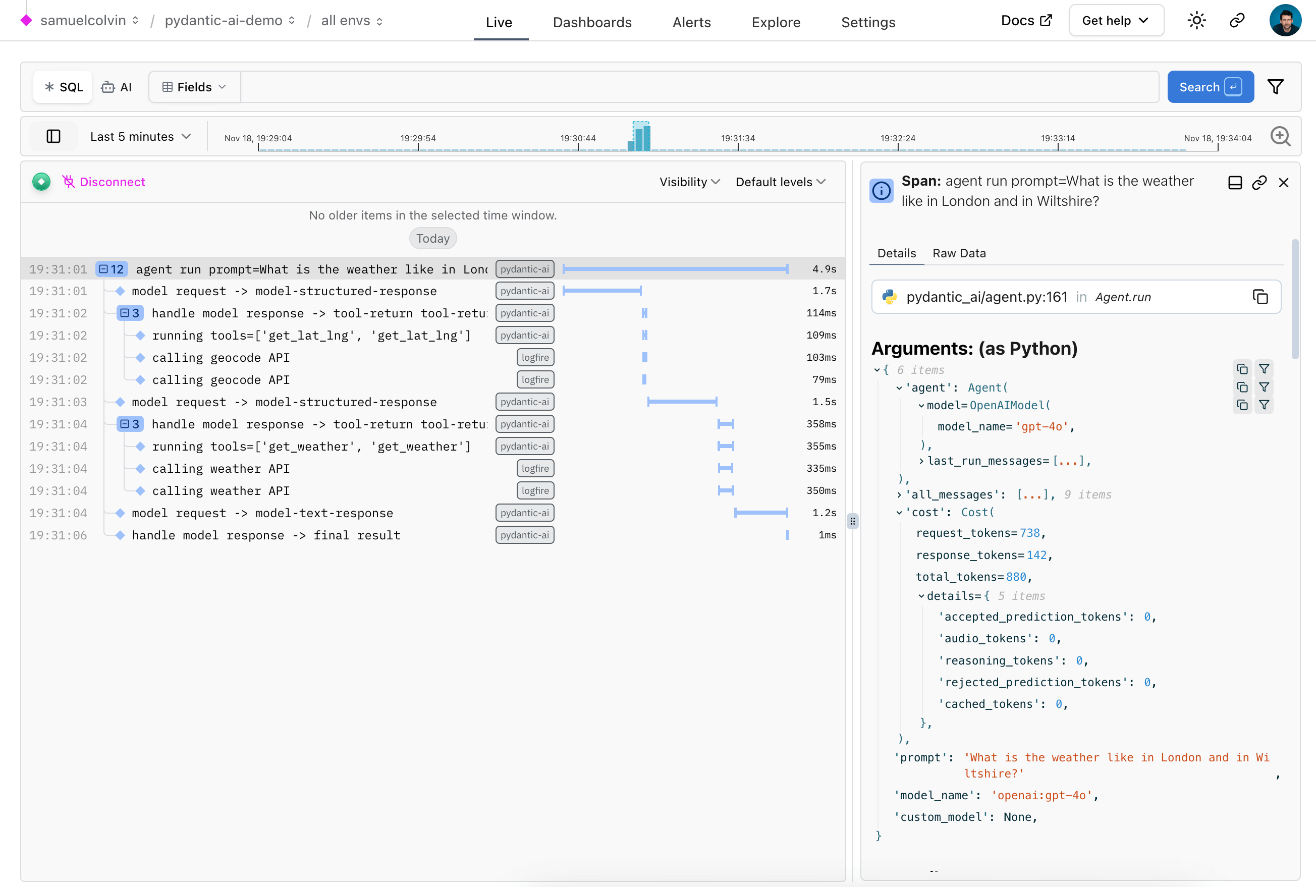 To demonstrate how Logfire can let you visualise the flow of a PydanticAI run, here's the view you get from Logfire while running the chat app examples: